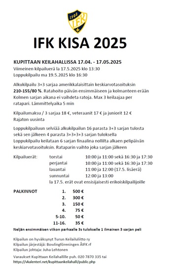 Kauden 2024-2025 viimeisenä erikoiskilpailuna Kupittaalla keilataan IFK Kisa. Alkukilpailussa keilataan 3+3 sarjaa am. keskiarvotasoituksin 210-155/80%. 19.5.2025 keilattavaan loppukilpailuun selviytyy alkukilpailun tasoituksellisten tulosten perusteella 20 keilaajaa tässä järjestyksessä: 16 parasta 3+3 tuloksella ja 4 parasta 3+3+3+3 tuloksella. Kilpailussa on rajaton uusinta.